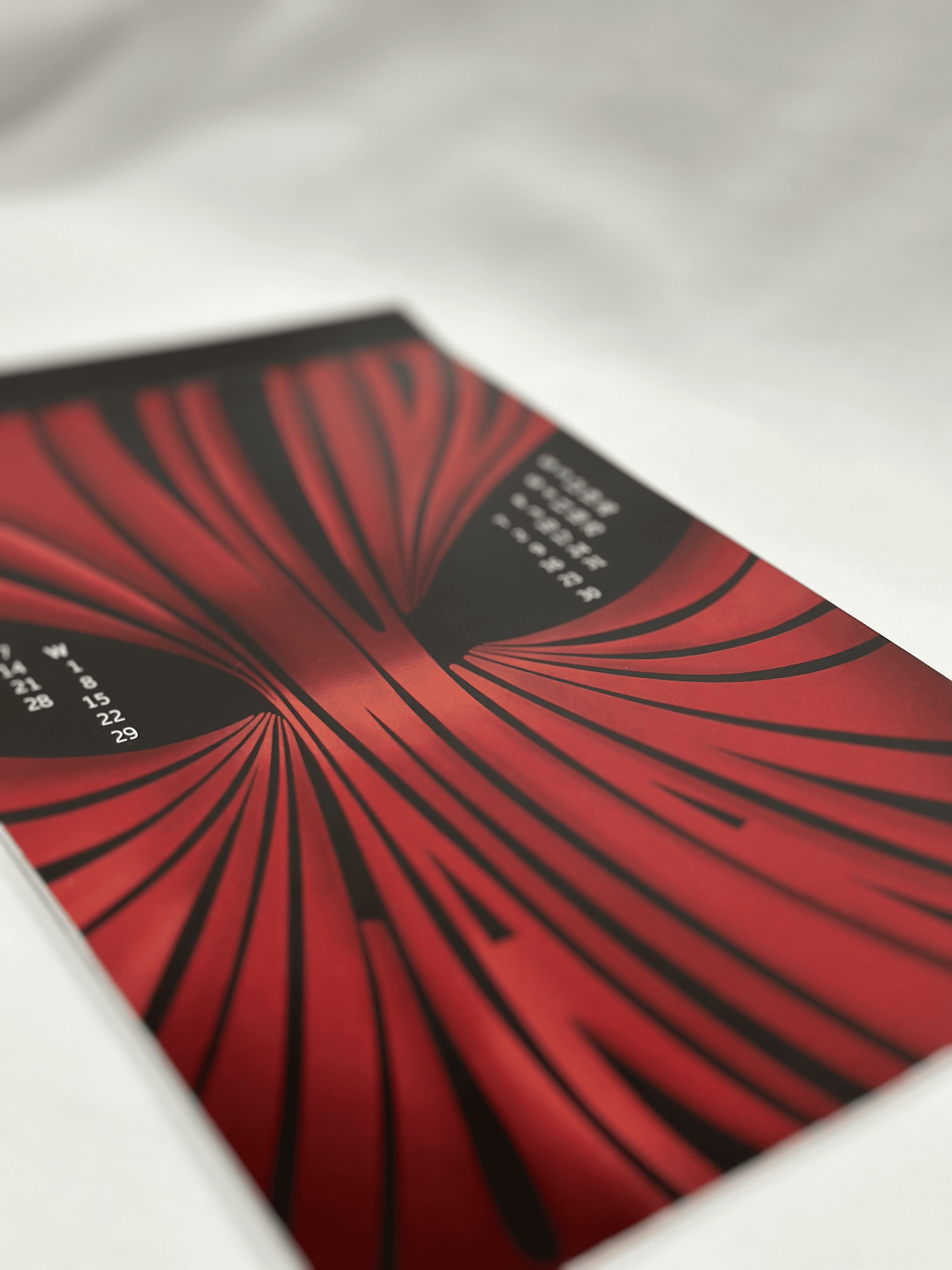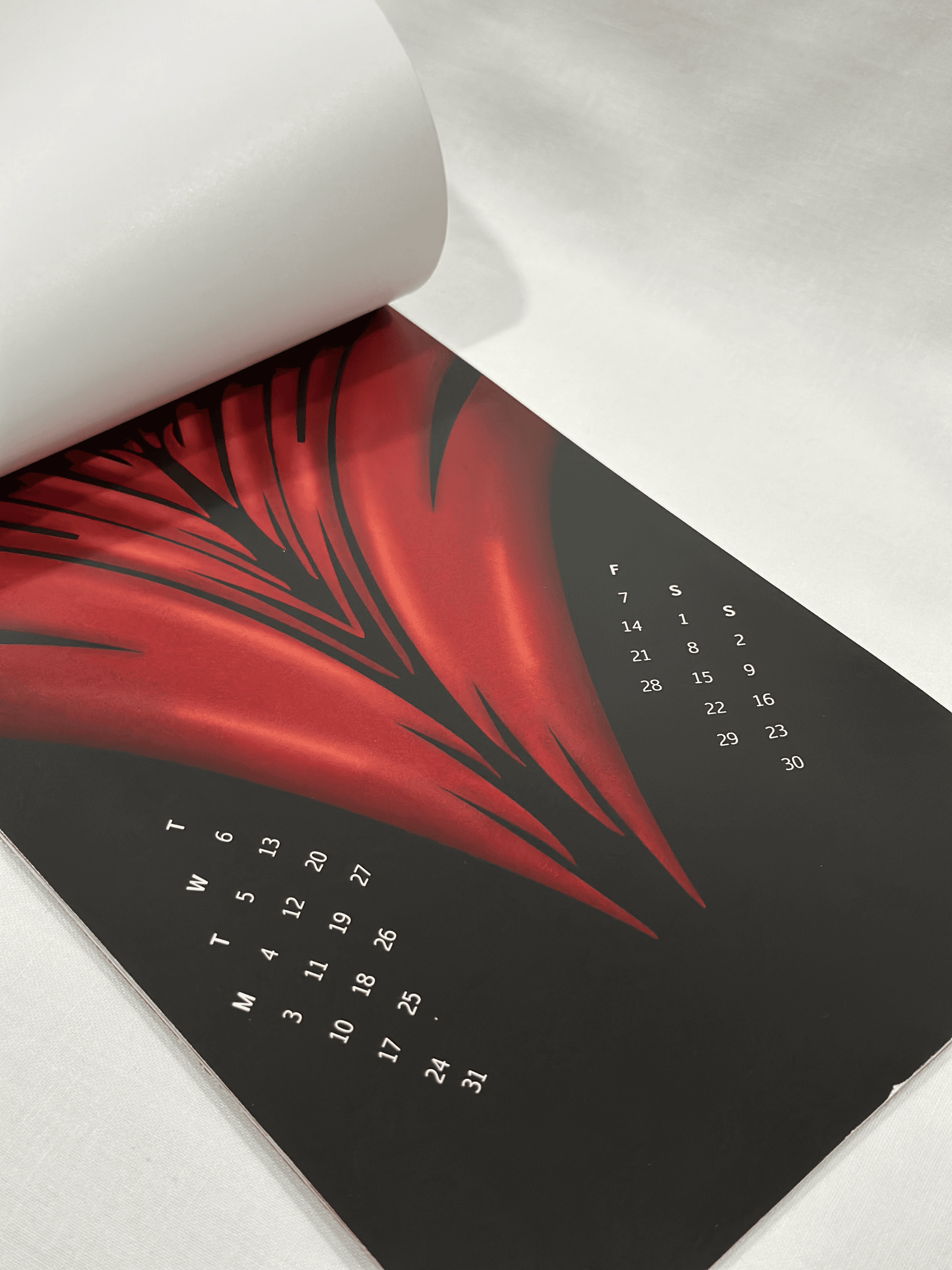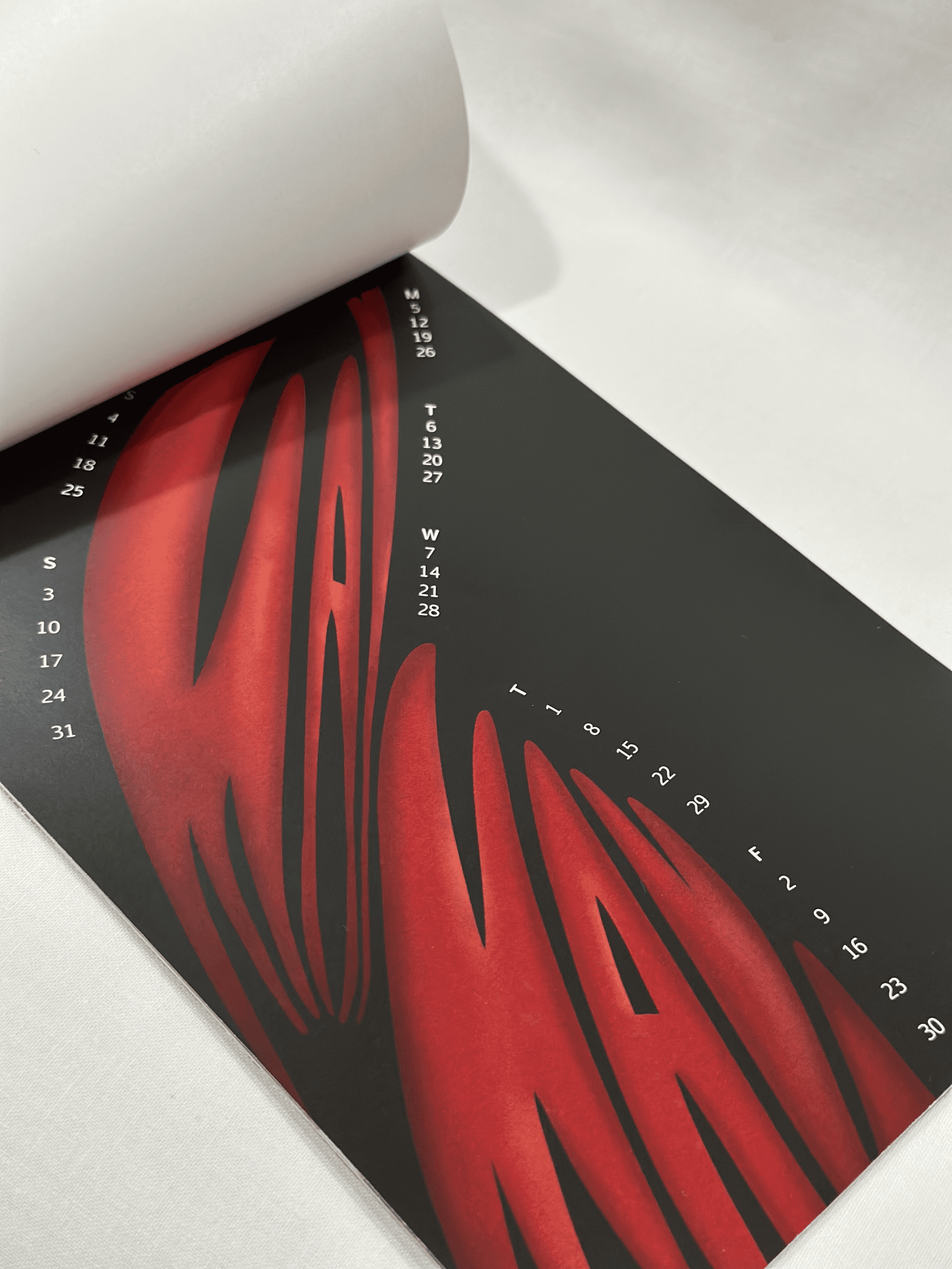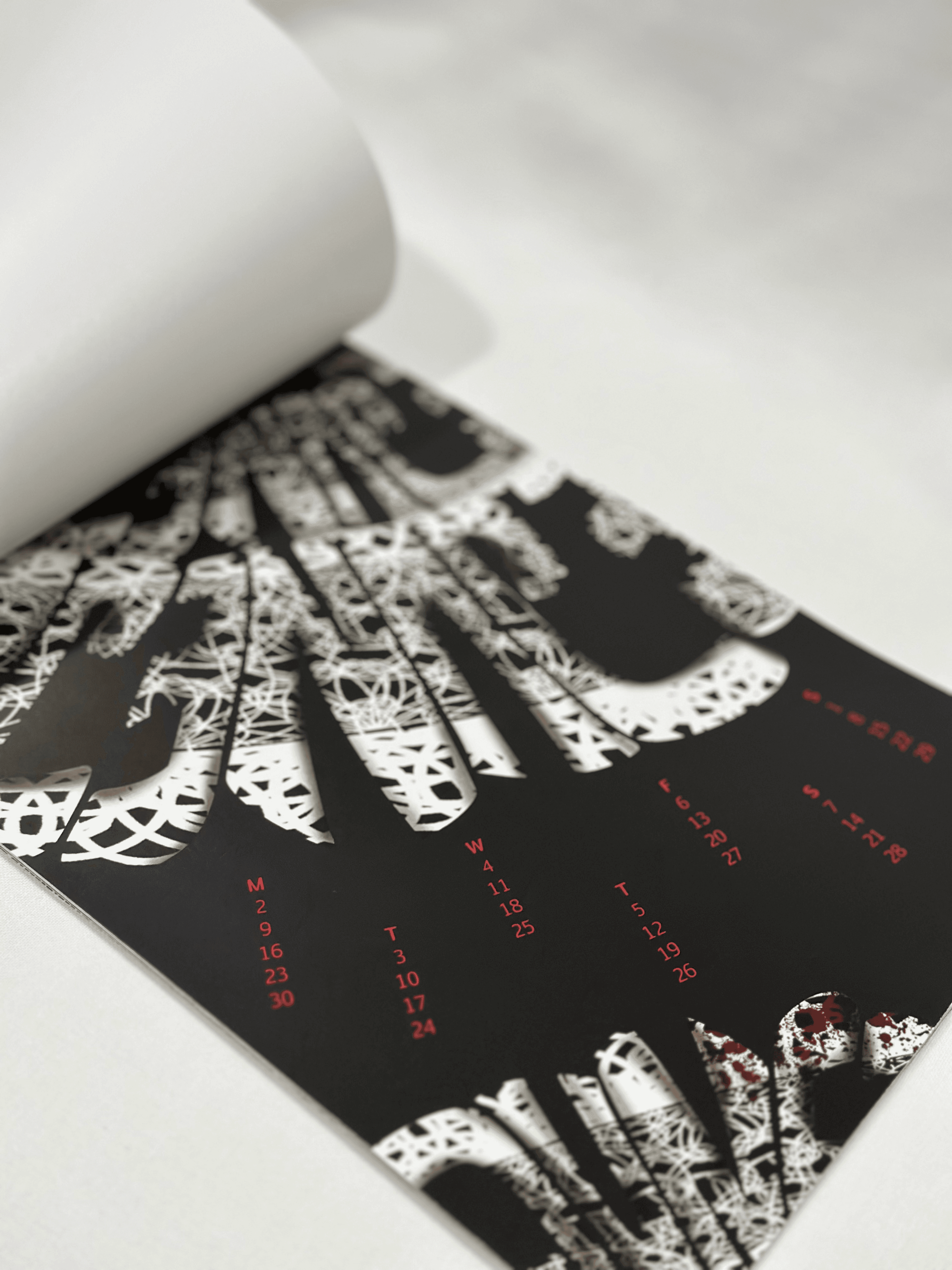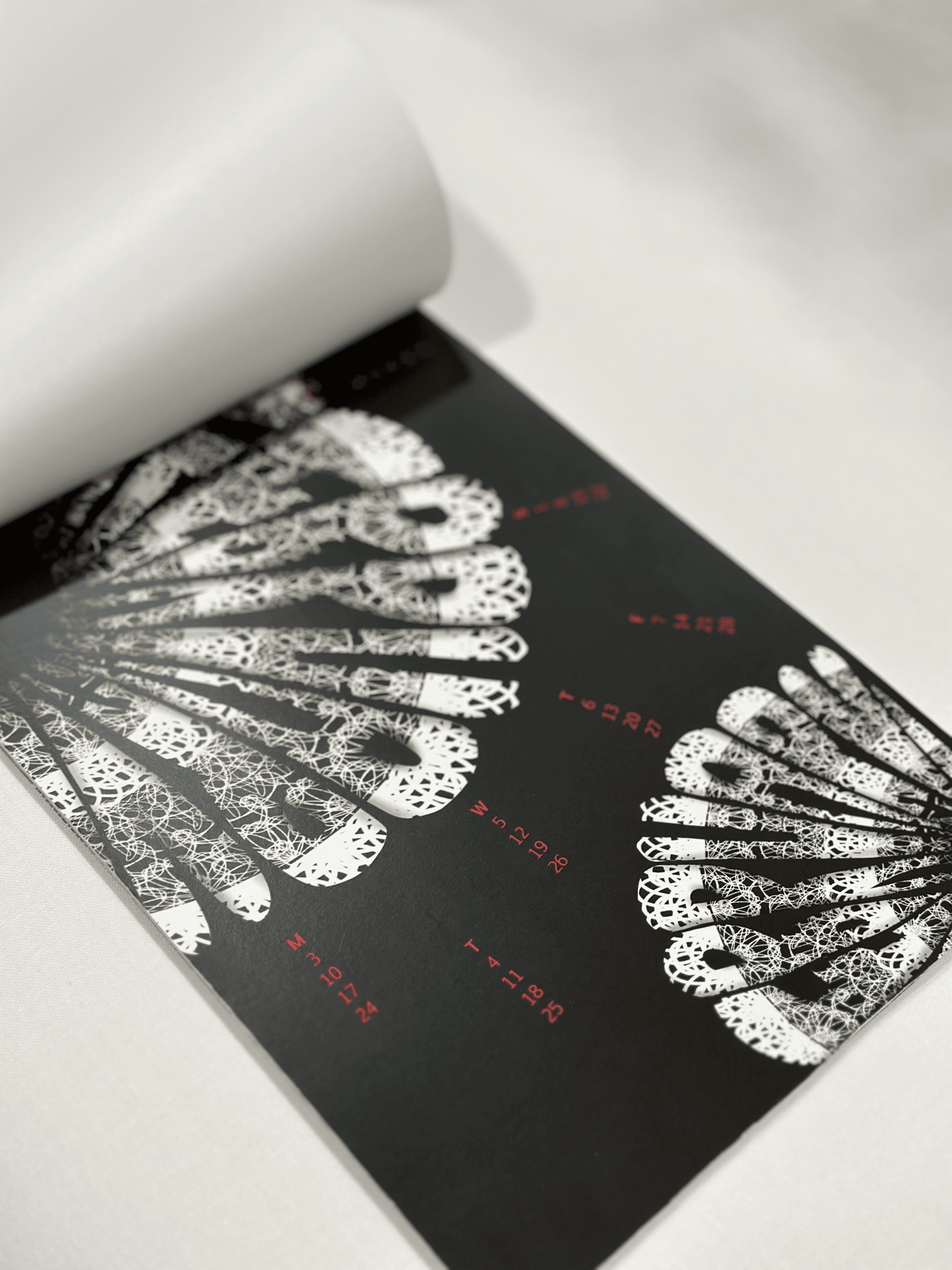 A typographic calendar heavily inspired by the artist Eiko Ishioka and her distinctive, eye-catching style. Notable works such as the costumes from Bram Stoker's Dracula (1992) and Mirror Mirror (2012) are referenced to highlight the dark, unique, and contrasting elements of Eiko's artistry, translated into typographic form.
